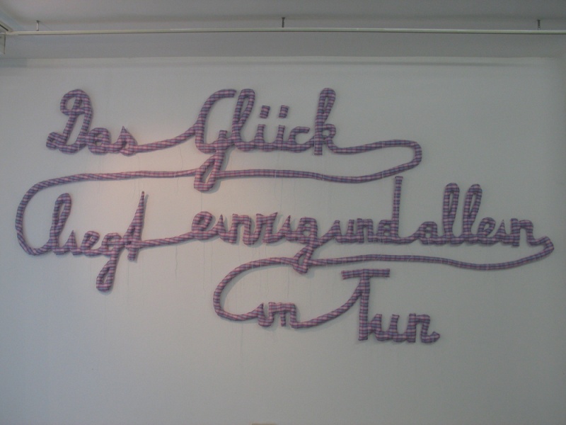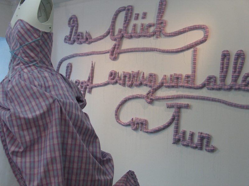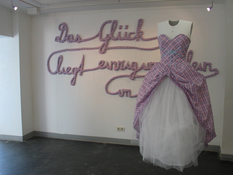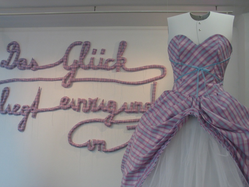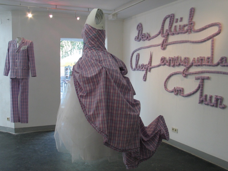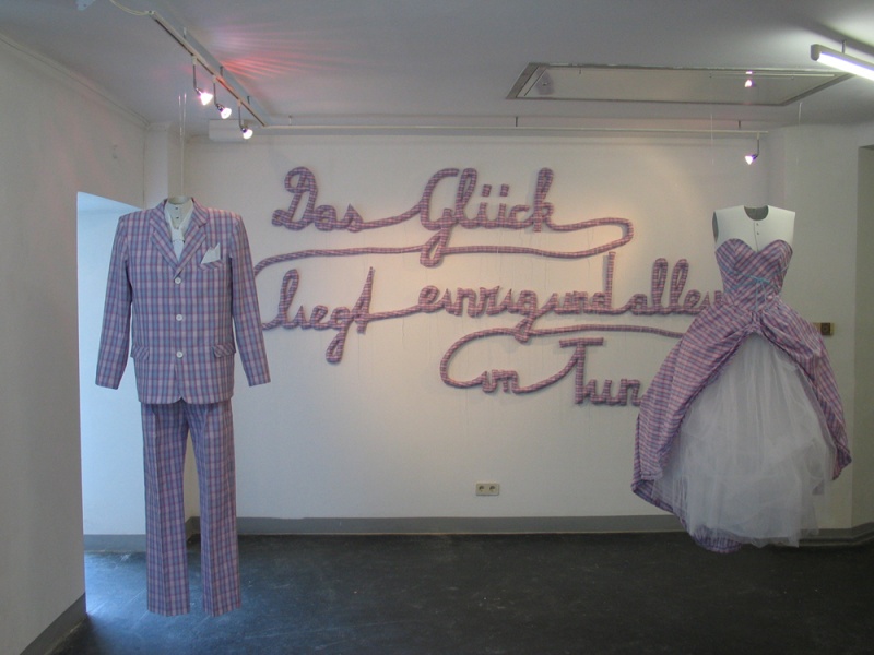 Installation: Schriftzug, Brautkleid und Anzug auf Karton-Schneiderpuppen, Sound: fröhliches Pfeifen mit 15 sec Pausen. Schriftzug: 300 x 170 cm, Kleid: Gr. 36, Anzug: Gr. 50, genäht aus Kittelschürzenstoff, 2010