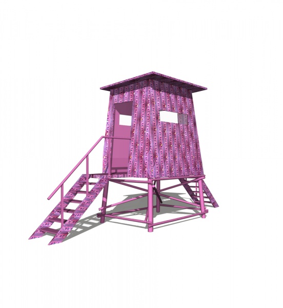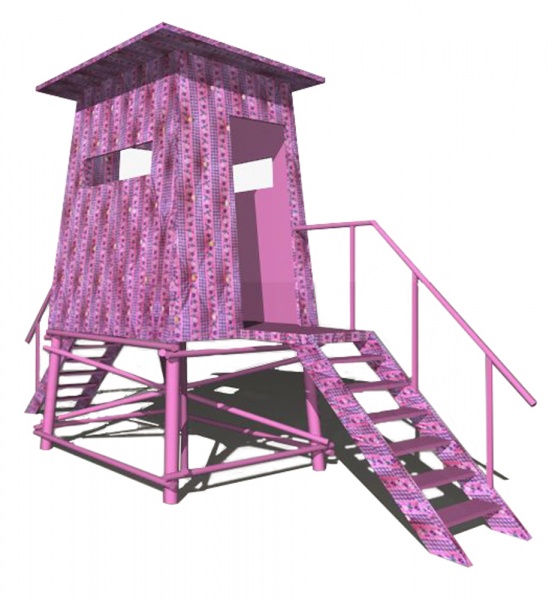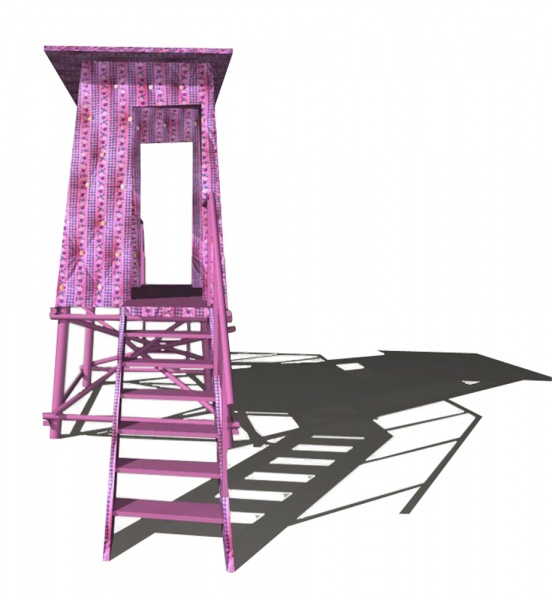 Dieses typisch männlich besetzte „Haus“ bekommt nun eine weibliche Überformung. Von außen wird der Hochstand mit einem typischen Muster der Kittelschürze, gedruckt auf glatter Plane, in der Manier der früheren Rechtsanwalts/Notar/Bank- und sonstigen geheimen Türen, rautenförmig-wattiert-abgesteppt umspannt. Die Kittelschürze Symbol für Land, für Alltag und Arbeit, für Frau, Mutter, Großmutter, sprich der weiblichen Genealogie umhüllt den gesamten Hochstand – weibliche Aneignung ehemals männlichen Territoriums findet auf symbolischer Ebenen statt.
